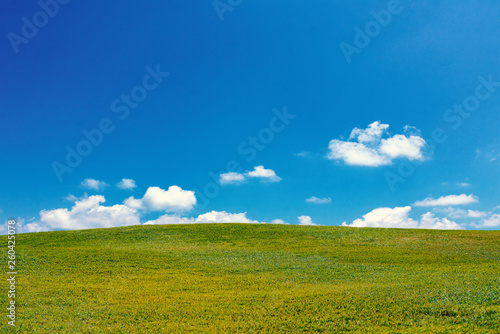 © Zenzeta, Obraz premium green grass field with clouds and blue sky background.