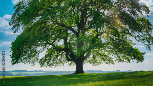Fototapeta premium Green grass field with tree in summer sunlight