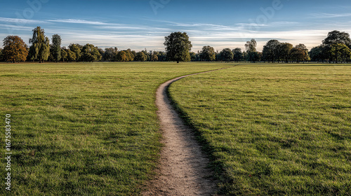 © Smart AI, Fototapeta premium Green grass field with winding dirt path under blue sky