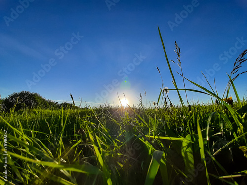 Fototapeta premium Green grass in the rays of the setting sun