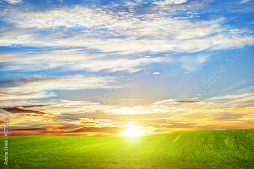 © Photocreo Bednarek, Fototapeta premium Green grass landscape at sunset. Romantic clouds