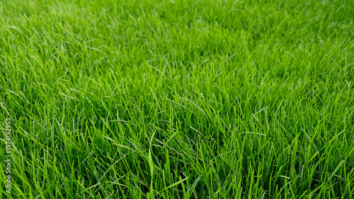 Obraz premium Green grass meadow, natural greenery background texture of lawn garden...