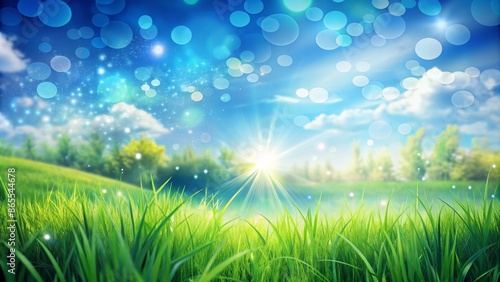 Obraz premium Green Grass Meadow with Bright Blue Sky and Bokeh Sun