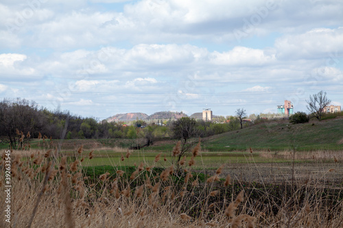 © glebchik, Fototapeta premium green grass on slopes of ravine. Behind mountains