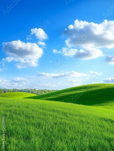 © kenkuza, Obraz premium Green grass on the hill with beautiful sky
