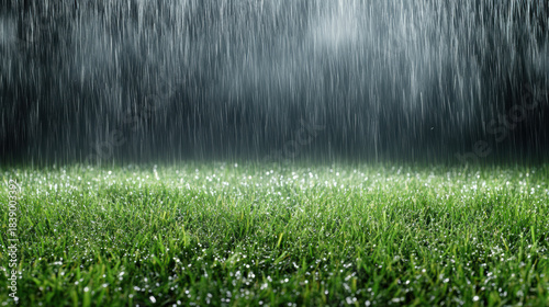 © siraphol, Obraz premium Green grass rain drops luminous wet field serene ambience