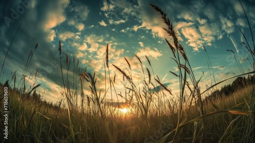 © Vladimir, Obraz premium Green grass view from below against a sunset sky. Closeup of blades of grass on the lawn