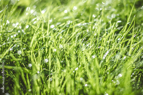 © katarinagondova, Obraz premium green grass with bokeh effect after rain