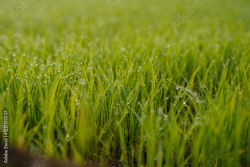 © Jayashree, Fototapeta premium green grass with dew drops.