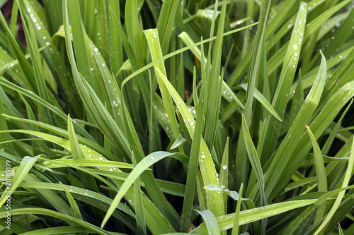 Obraz premium Green grass with dew drops on it.