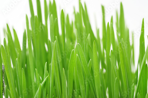 © SERGIYVOLODYMYROVYCH, Naklejka premium Green grass with dew drops sprouted from the wheat grains with roots on a white background