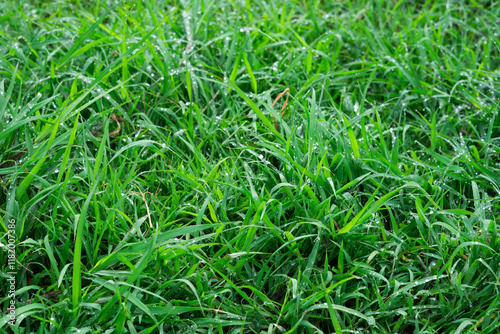 © berkahjayamaterial, Fototapeta premium Green grass with morning dew background