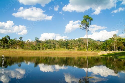 © parinya, Obraz premium Green grass with sky reflecting in the forest