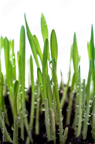 © Alla, Fototapeta premium Green grass with water drops isolated on white background