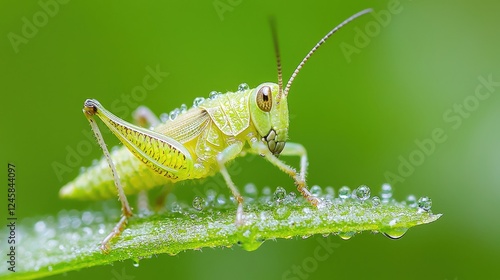 Fototapeta premium Green grasshopper on dew-covered leaf, nature background, macro photography,...