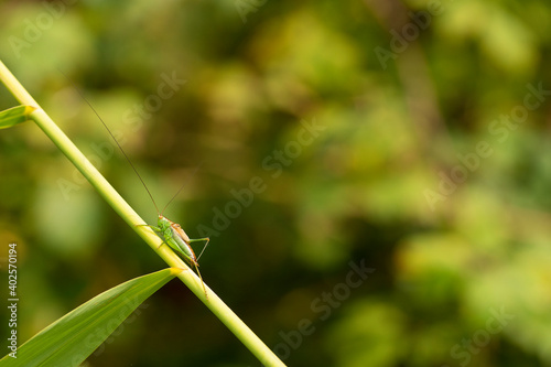 © Leoniek, Naklejka premium Green grasshopper or bush cricket standing on a green leaf isolated in a natural green background.