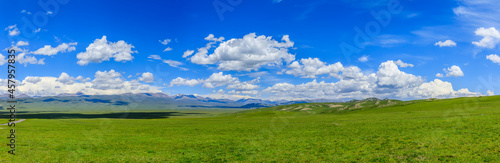 Fototapeta premium Green grassland natural scenery in Xinjiang,China.Wide grassland and blue sky with white clouds landscape.panoramic view.