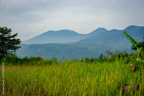 © Hidayat, Fototapeta premium Green grassland with mountain ranges in the distance under a cloudy sky.