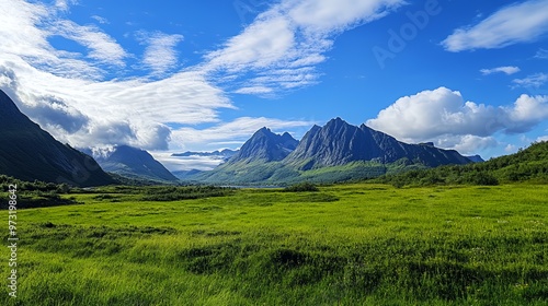 © BROPRADANA, Fototapeta premium Green grassy field with mountains and blue sky in the background.