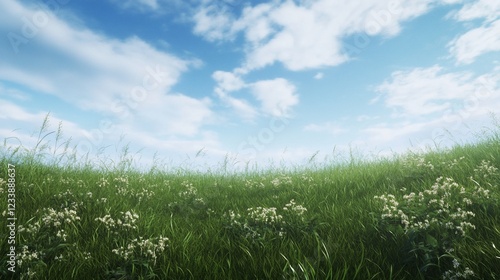 Naklejka premium Green grassy hill with scattered white flowers under a blue sky with clouds