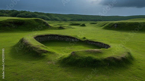 © Hafiz, Obraz premium Green grassy landscape featuring ancient circular stone structures