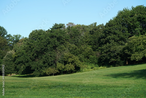 © John, Naklejka premium Green grassy meadow with trees in public park in summer
