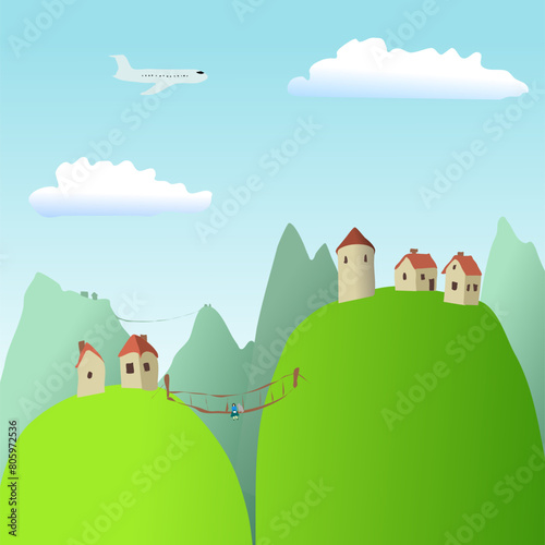 © Rystemys, Fototapeta premium Green grassy mountains on the background of a mountain landscape and small houses in the distance. Vector illustration, mountain everyday life, silence, clean air and cartoon landscape design. Some