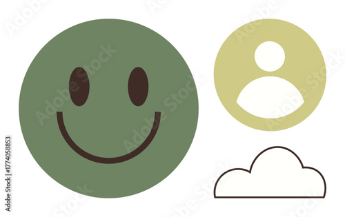 Fototapeta premium Green happy circle, beige user icon, and simple black cloud outline representing happiness, community, and connectivity. Ideal for communication, positivity, tech, cloud storage digital interaction