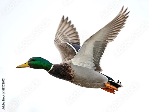 © BISO, Fototapeta premium Green-Headed Bird in Air Movement on White Surface