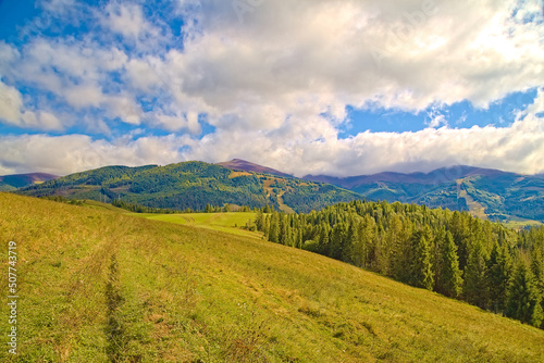 Naklejka premium Green high mountains are covered with coniferous trees. Fluffy white clouds...