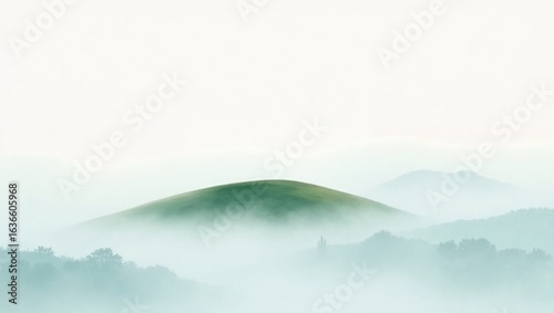 © Janna, Fototapeta premium Green hill in misty morning landscape with soft white sky