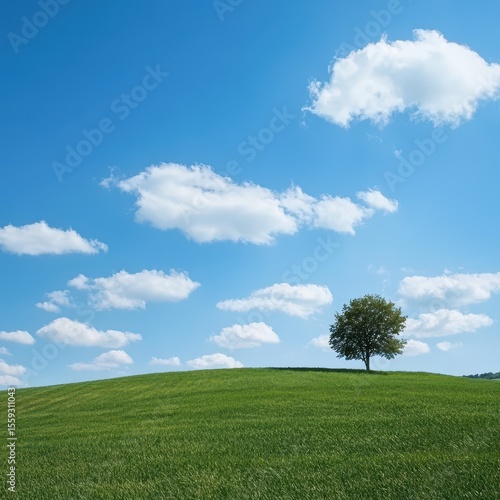 © Andrii, Fototapeta premium Green hill lone tree blue sky