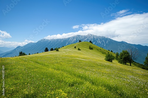 © Vadym, Fototapeta premium Green hill near Triglav Mountain in Slovenia. Breathtaking alpine landscape with rich grass, rocky peak, and vast sky. Scenic view of stone-covered hillside with natural beauty.