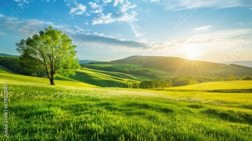 © amorn_m, Obraz premium Green hills and a single tree at sunset.