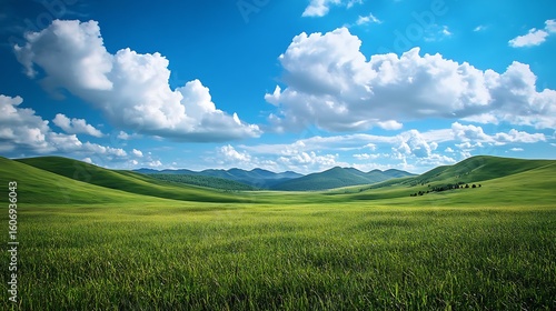 © Haseeb, Fototapeta premium Green hills and blue sky with clouds in scenic landscape