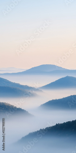 © lisbeth, Fototapeta premium Green hills and forests on a sunny day, featuring misty fields and haze, showcasing a minimalist gradient that highlights the serene beauty of nature