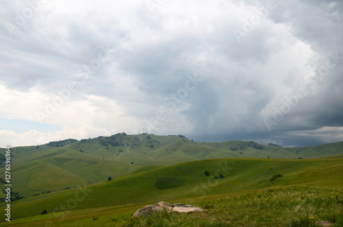© Alena Grebenkina , Fototapeta premium Green hills and mountains, panoramic view of mountains, before rain