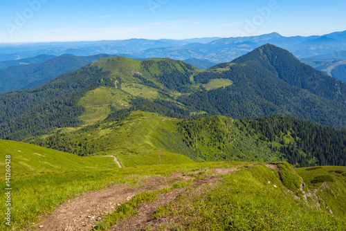 Naklejka premium Green hills covered with fresh grass and pine forest