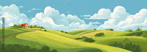 © Tanish, Obraz premium Green Hills Farm Landscape Illustration with Blue Sky and Clouds
