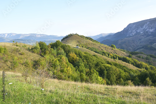 © brszattila, Naklejka premium Green hills in mountain valley. spring landscape