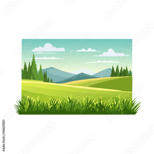 Obraz premium Green hills landscape illustration with grass, mountains, trees, and cloudy sky in flat vector design