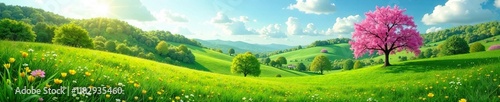 © Supharak wonginyoo, Obraz premium Green hills with trees and flowers blooming in spring, flower, tree