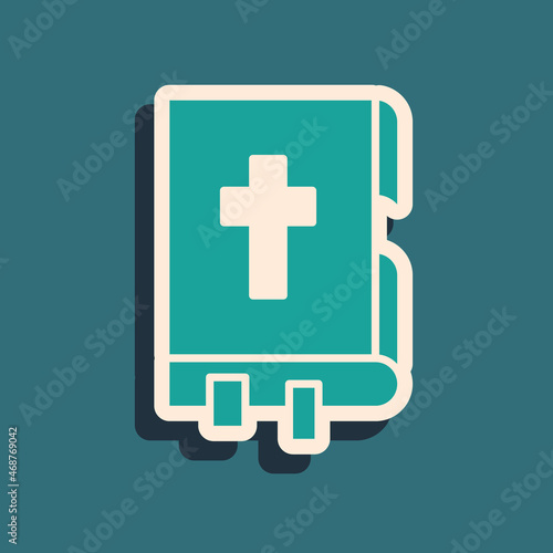 © vector_v, Obraz premium Green Holy bible book icon isolated on green background. Long shadow style. Vector Illustration