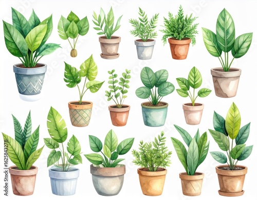 © ruzz, Obraz premium Green Houseplants in Pots Watercolor Collection