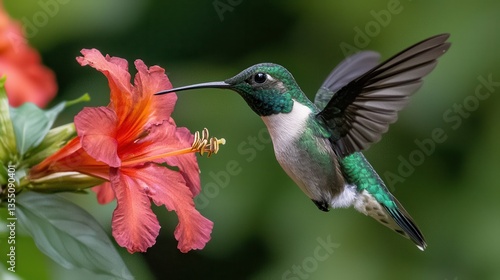 © Nana, Fototapeta premium Green Hummingbird and Coral Flower in Lush Garden Setting