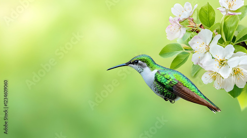 © Lailatul, Fototapeta premium Green hummingbird hovering near blooming apple tree branch, spring nature background; ideal for greeting cards