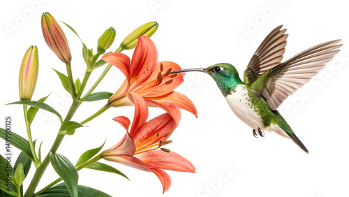 © jhon, Obraz premium Green Hummingbird Hovering Near Orange Lilies on White Background