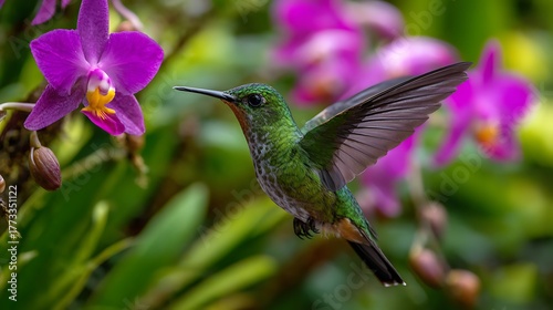 © Pasindu, Naklejka premium Green hummingbird in flight near purple orchids with blurred background in a natural setting outdoors