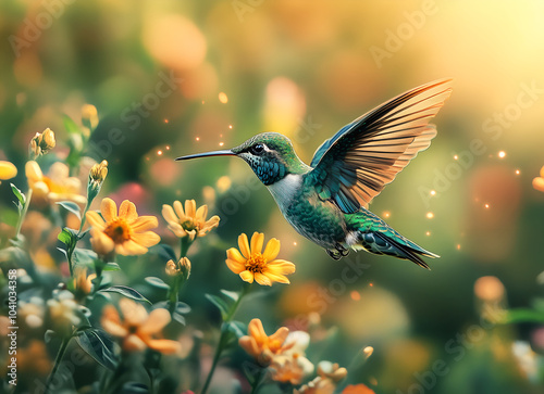 © Anuson, Fototapeta premium green hummingbird with colorful feathers hovers near flowers in the air