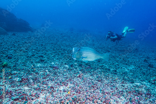 Fototapeta premium サンゴ礁の海底を泳ぐカンムリブダイGreen humphead parrotfish、Bolbometopon muricatum...